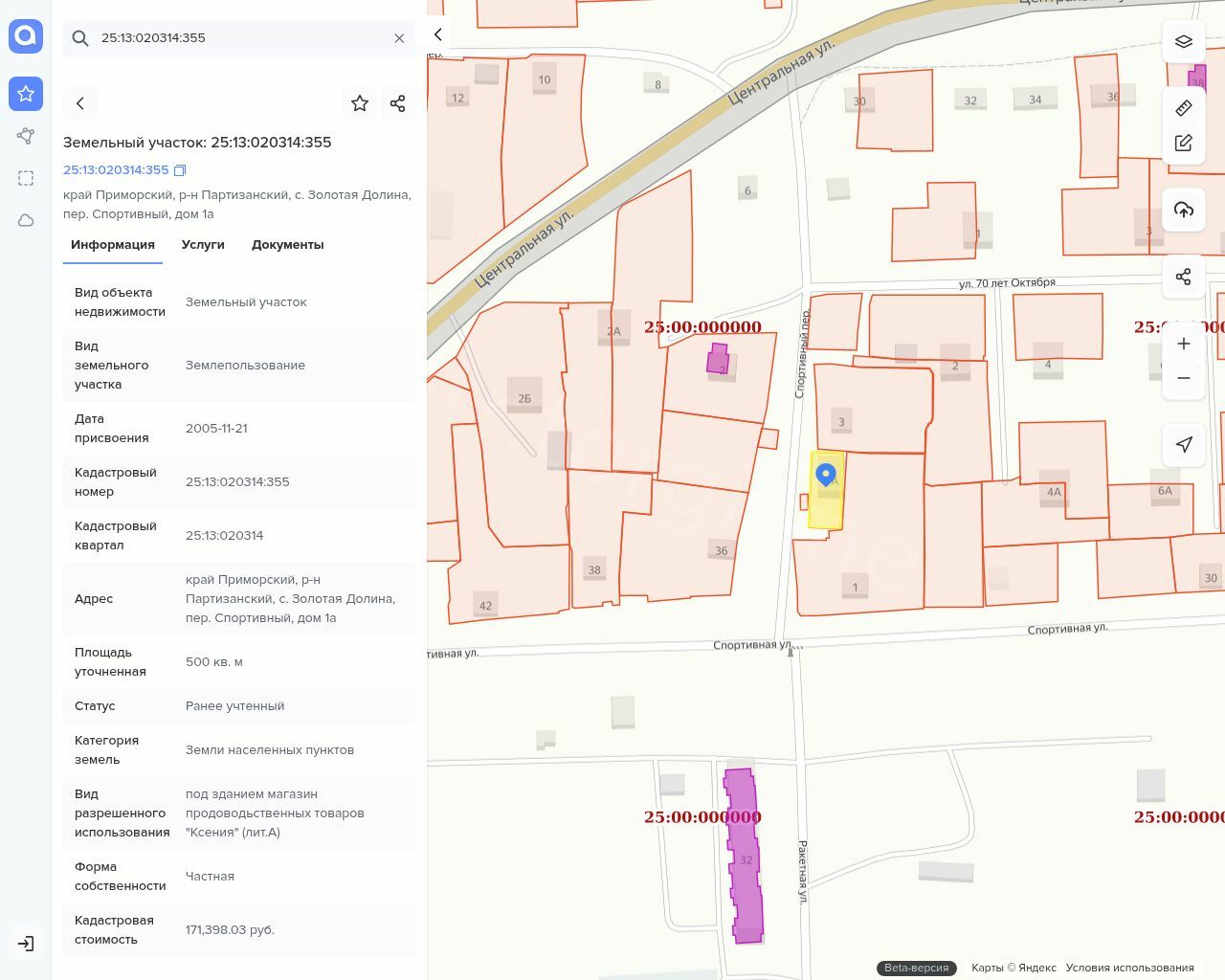 Земельный участок, кадастровый номер 25:13:020314:355, общей площадью 500 кв. м, категория земель: земли населенных пунктов, вид разрешенного использования: под зданием магазин продовольственных товаров «Ксения» (Лит. А) Нежилое здание магазин продовольственных товаров «Ксения», площадь: 92,5 кв. м., количество этажей 1, в том числе подземных 0, кадастровый номер: 25:13:000000:383; расположенное на земельном участке с кадастровым номером 25:13:020314:355